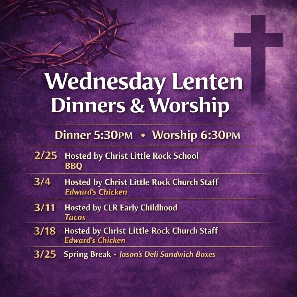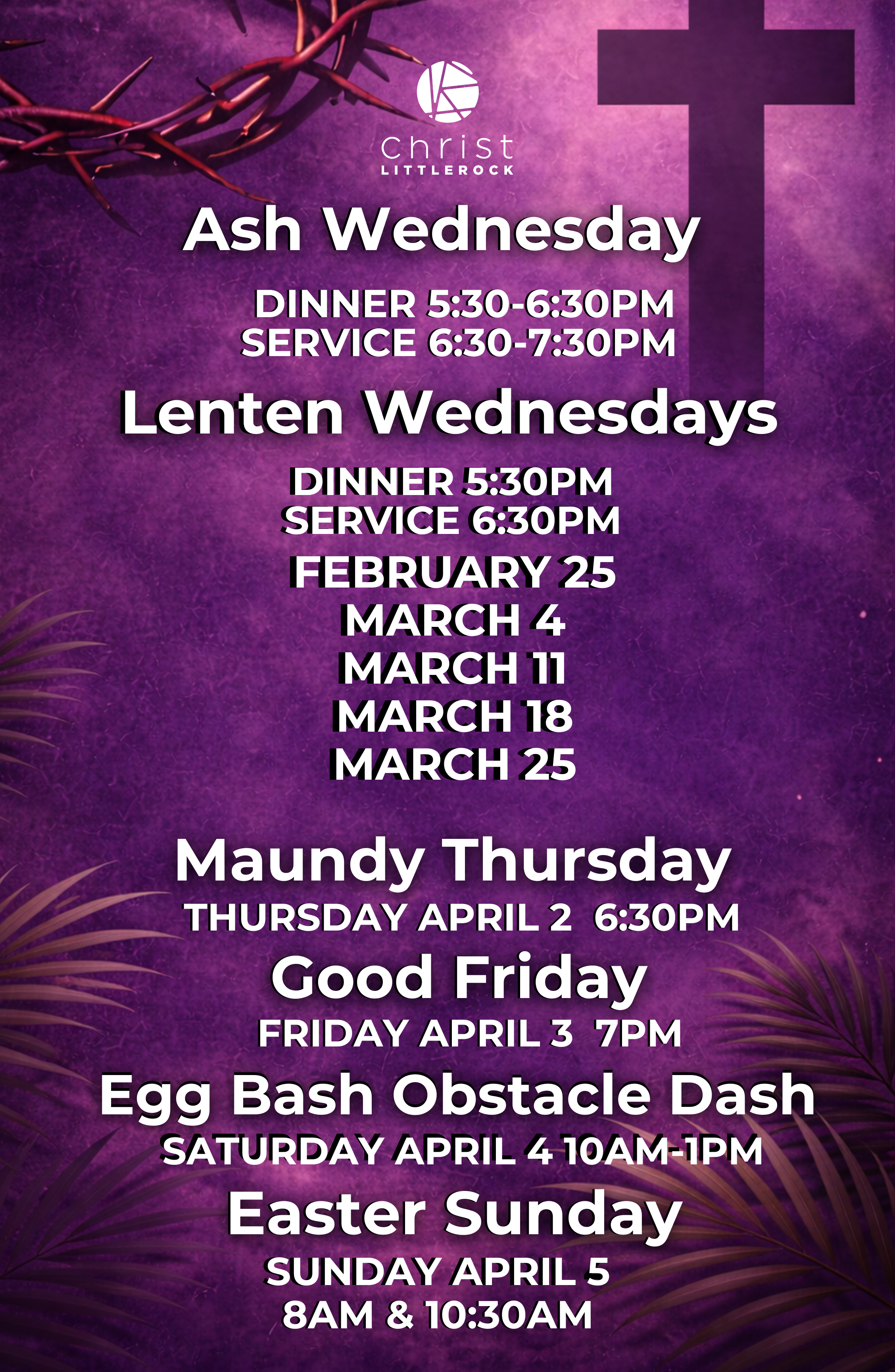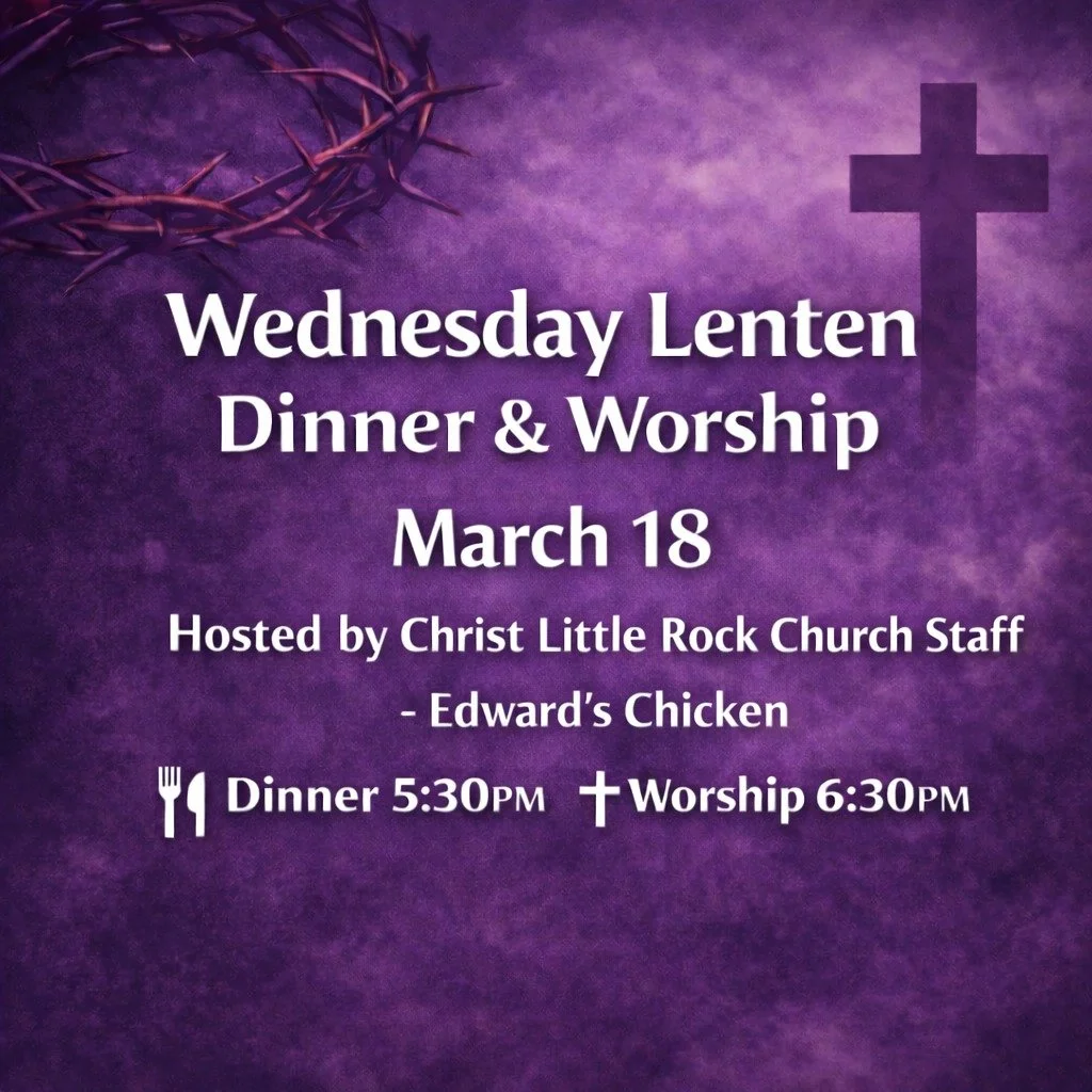 Join us for Lent at Christ Little Rock! Lent is a season of reflection, repentance, and renewal as we journey toward the cross and the hope of Easter. Throughout this season, we gather to worship, pray, and grow togetherāreturning to Godās grace and strength for our lives.