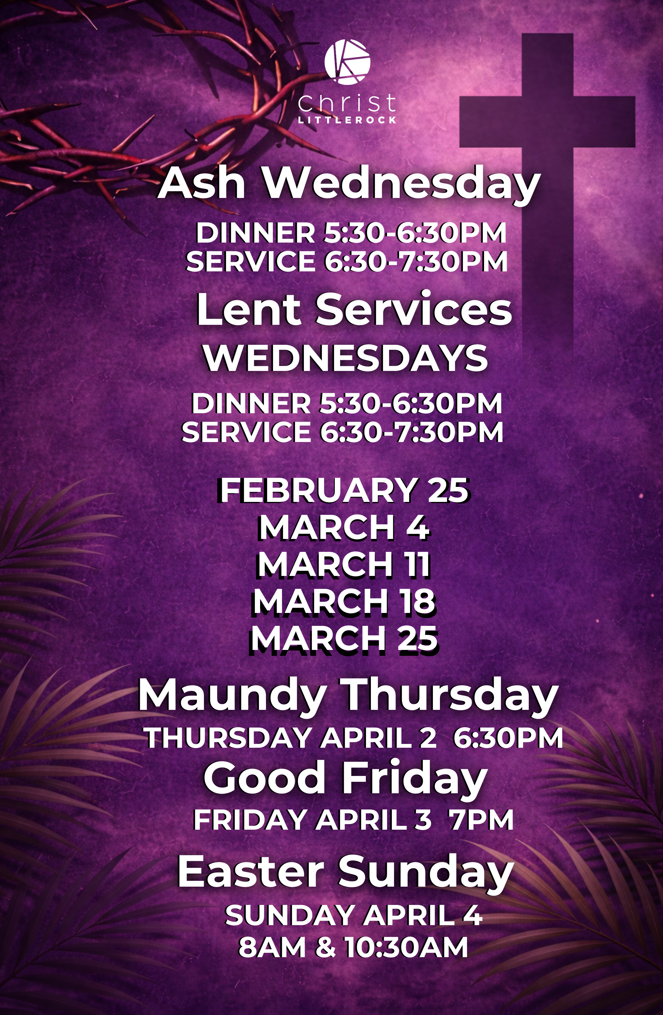 Worship | 6:30 PMAsh Wednesday provides us the opportunity to pause, reflect, and repent as we begin our Lenten journey. As we hear the first roar of the season, we are reminded of our sin, our frailty, and our deep need for a Savior.